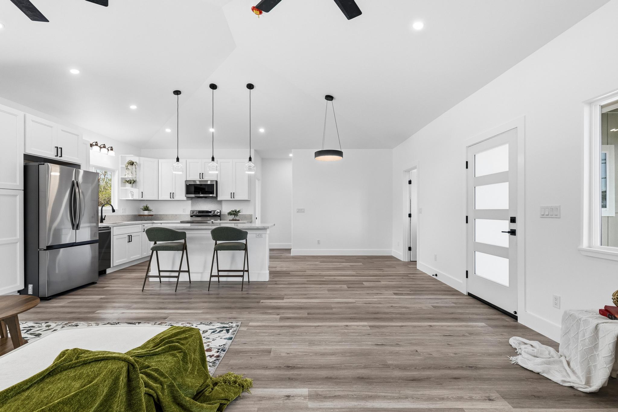 A concrete driveway and freshly planted landscaping create a welcoming first impression and beautiful curb appeal. Inside, the home opens to a light filled open concept living space designed for seamless flow and comfort.