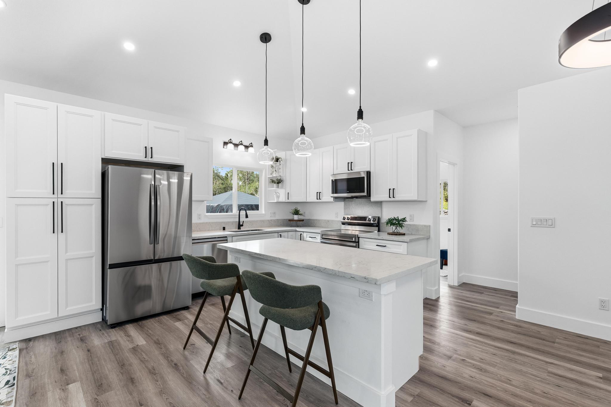 The kitchen is both functional and stunning, featuring quartz countertops, an expansive island with pendant lighting, an oversized sink, and brand new stainless steel appliances. Sliding glass doors lead to a covered lanai and generous backyard, creating effortless indoor outdoor living.