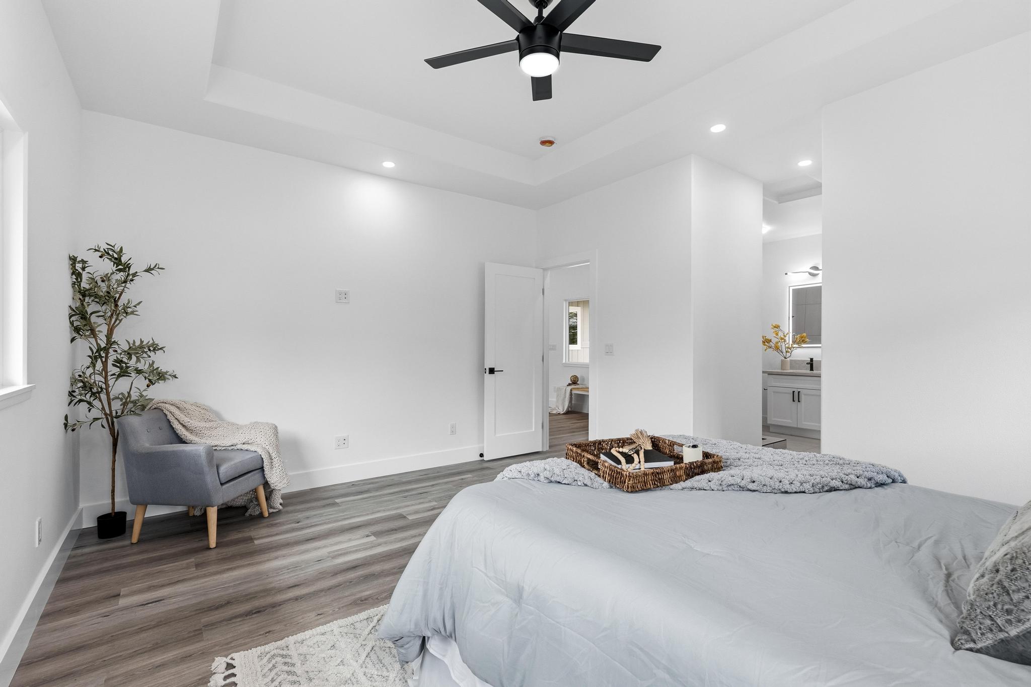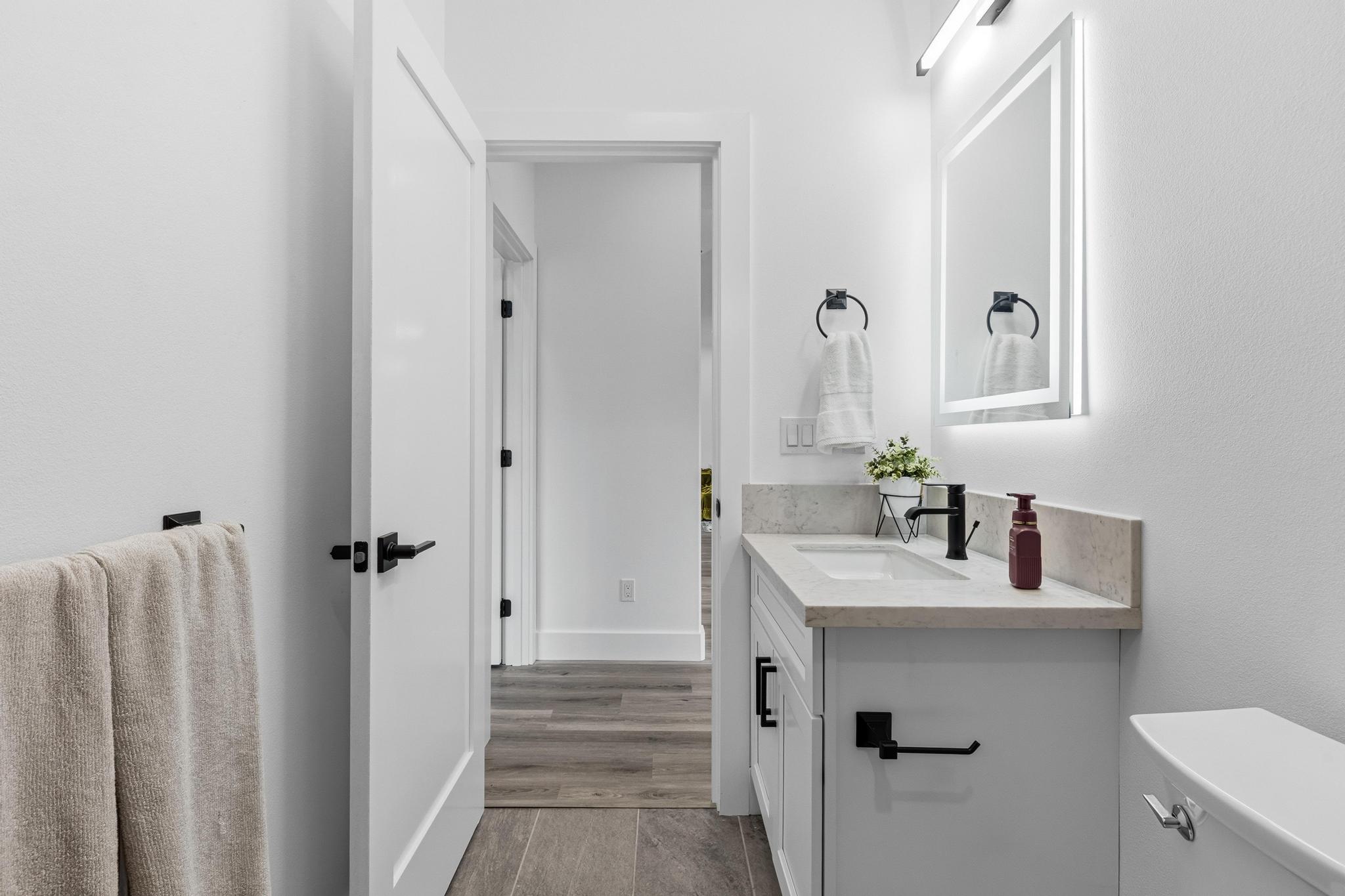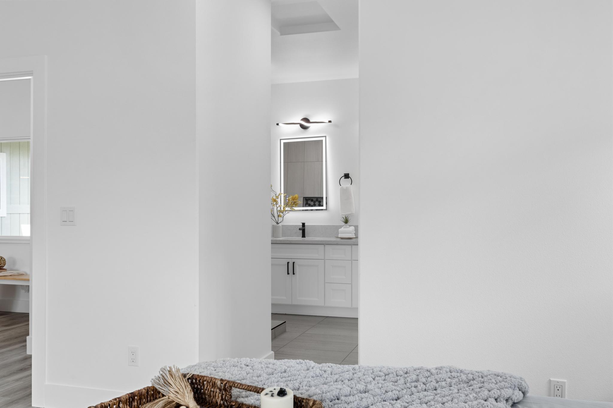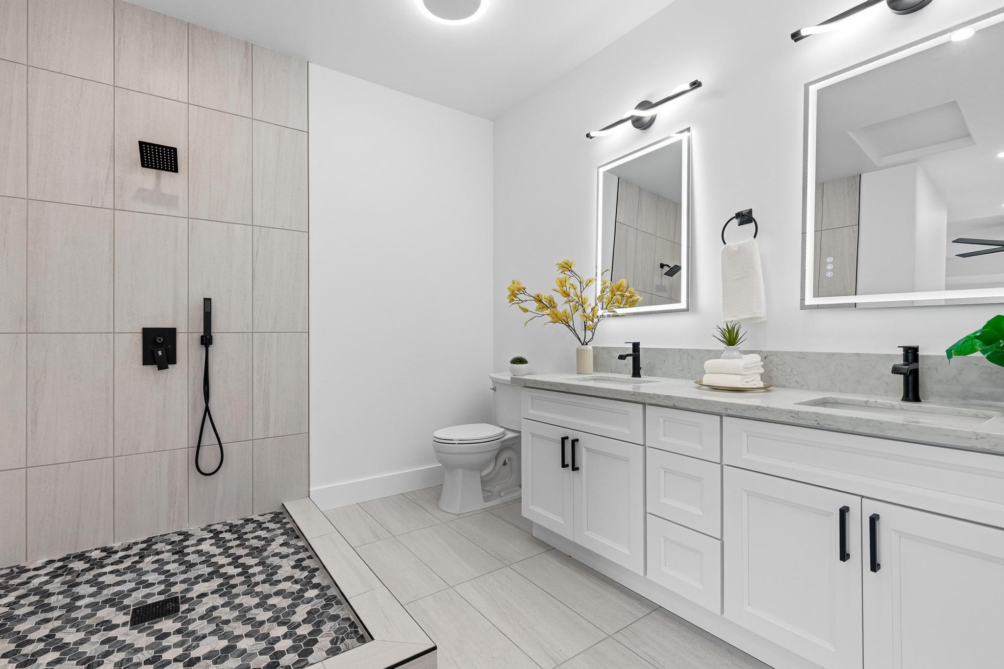 Two spacious guest bedrooms are positioned near a beautifully finished guest bath with a tiled tub surround and modern lighted mirror. Privately located on the opposite wing of the home, the primary suite is exceptionally large and offers a spa inspired bath with dual vanities, lighted mirrors, an oversized open concept walk in shower, and a walk in closet.