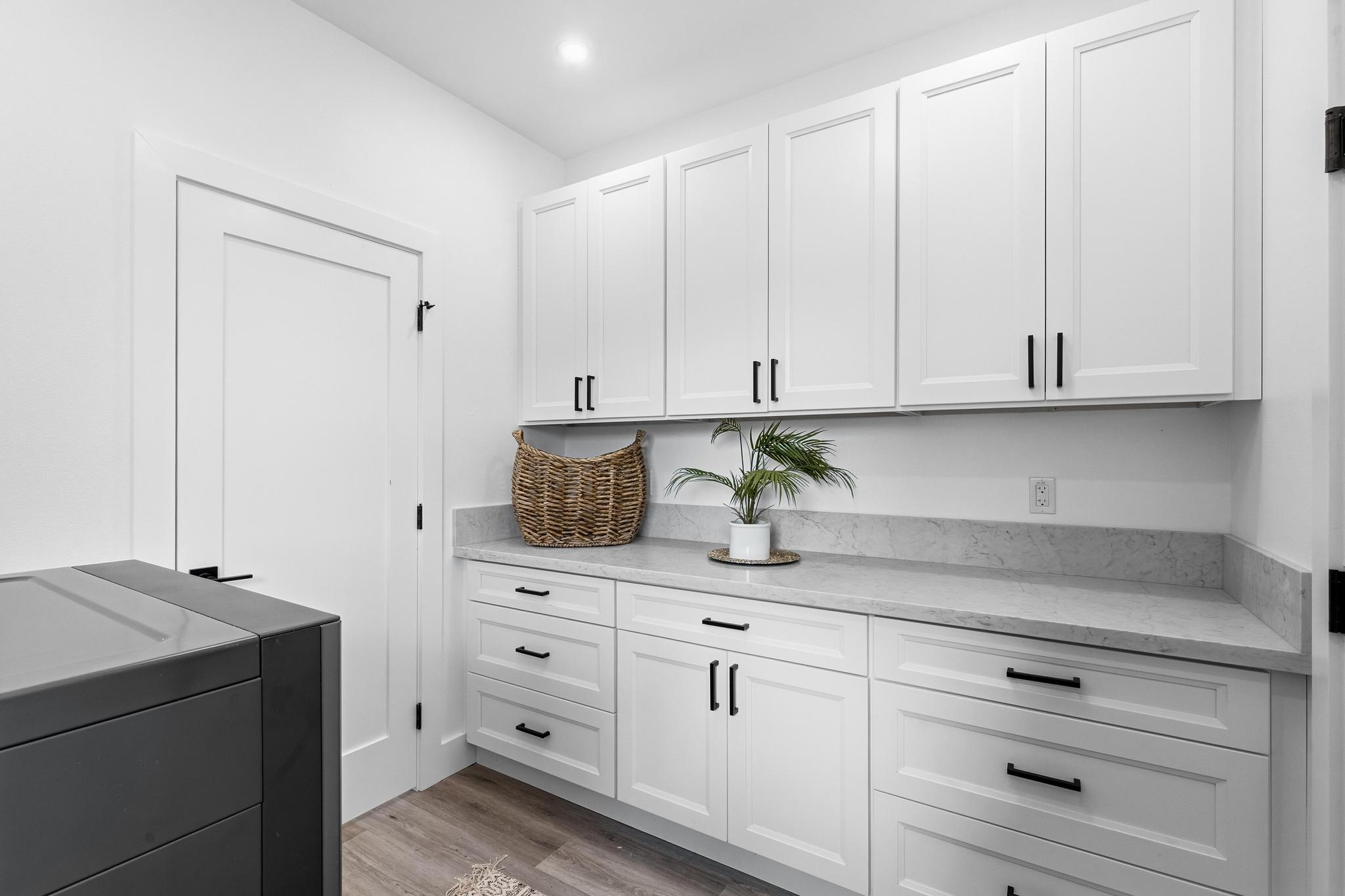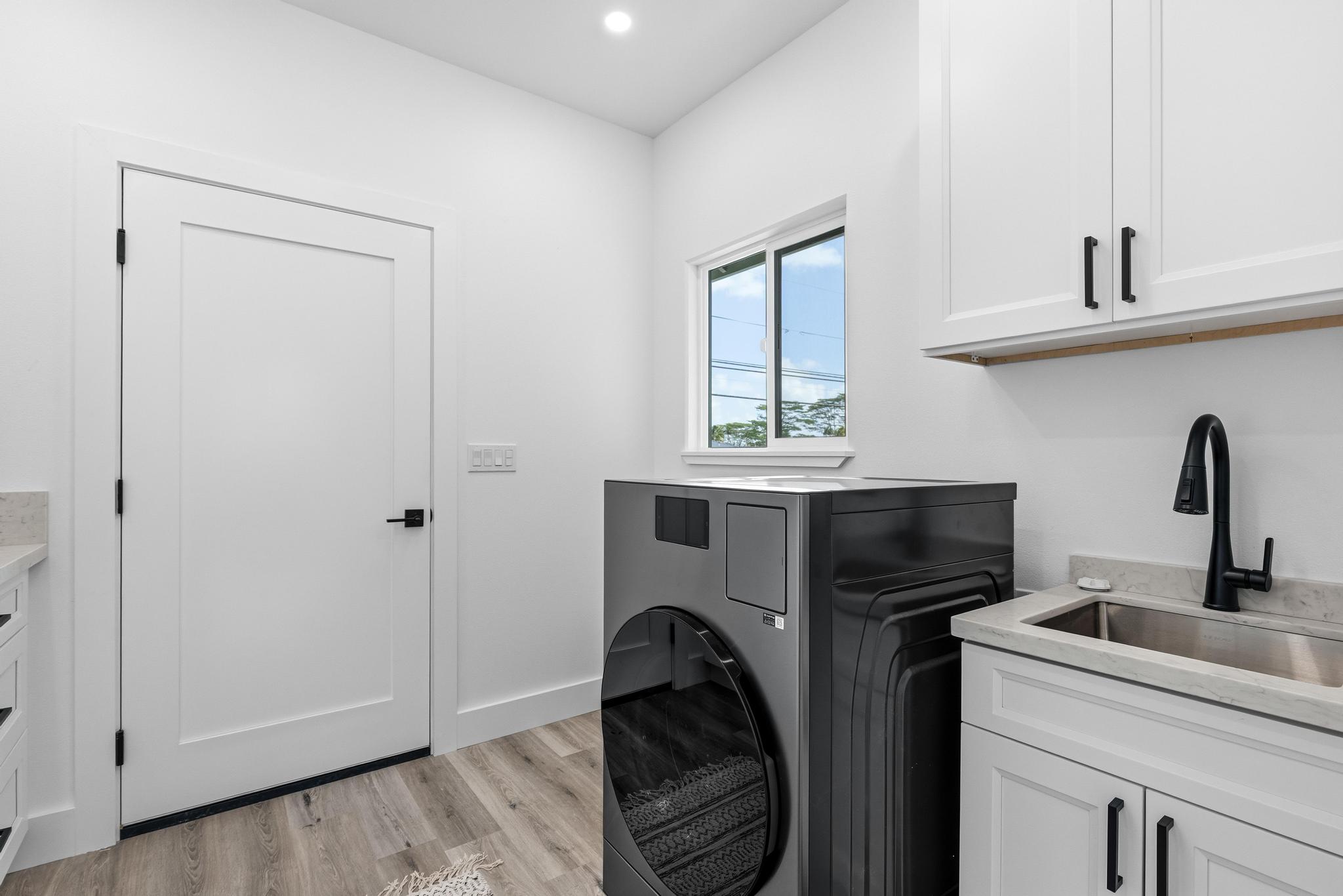 A well appointed laundry room includes a washer, utility sink, and abundant cabinetry, with direct access to the oversized garage offering additional storage.