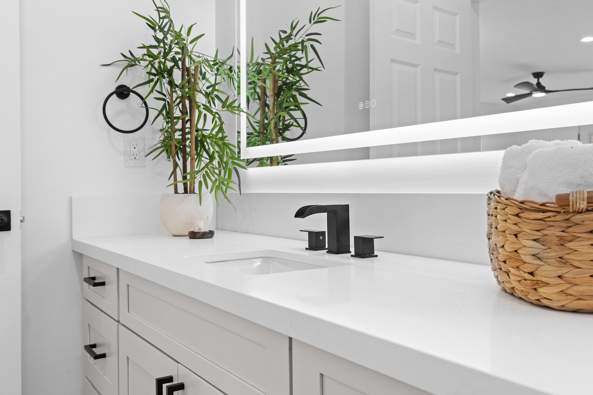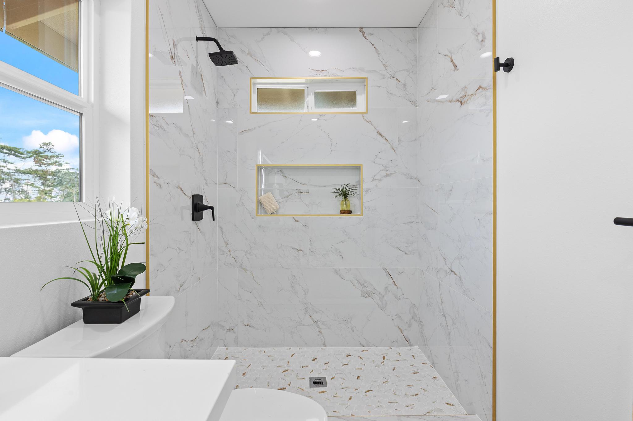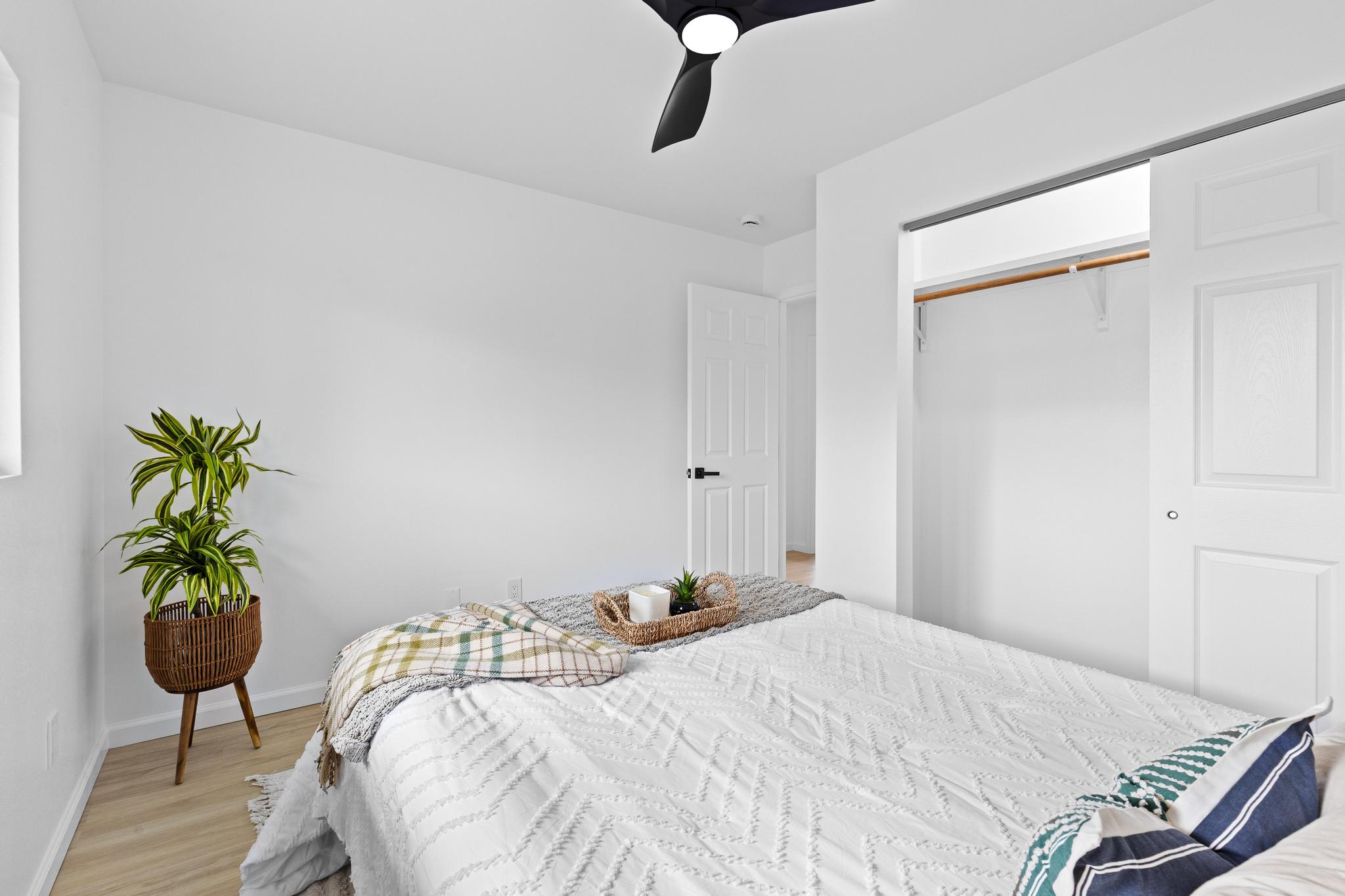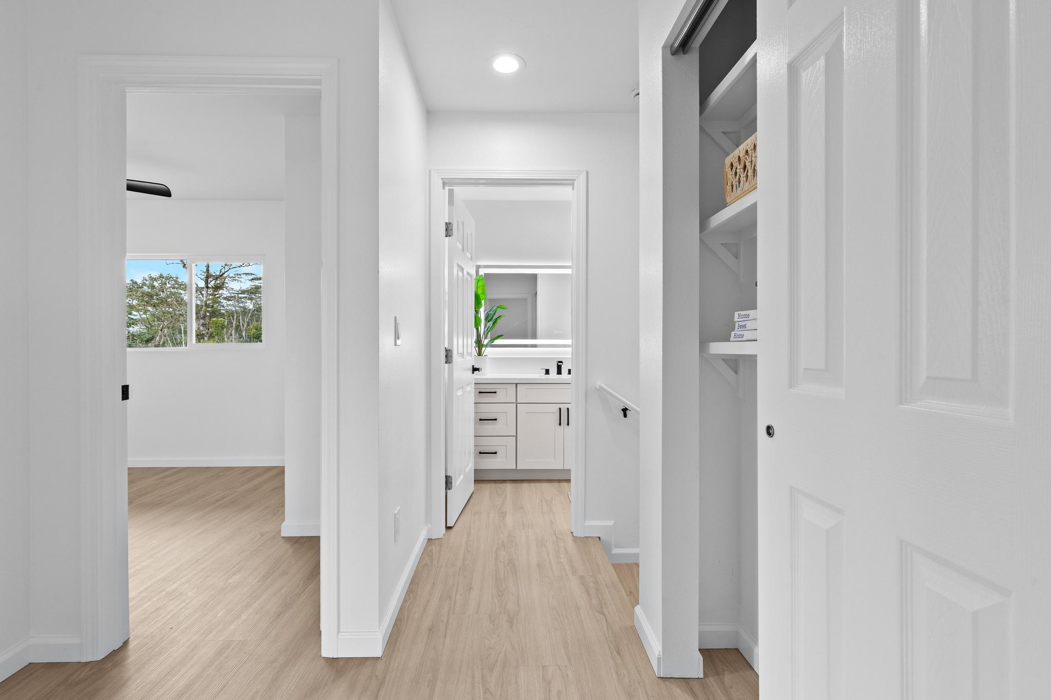 Built up to maximize space and efficiency, the home features over 1,200 sq ft of interior living with a functional layout that separates living and sleeping areas. All three bedrooms are located upstairs, creating a private retreat away from the main living space. The primary bedroom includes its own private lanai, perfect for enjoying morning coffee or unwinding in the evenings. While there is no traditional ensuite bath, the upstairs level includes a beautifully finished full bathroom with a sleek vanity, contemporary fixtures, and a walk-in shower. A dedicated upstairs laundry room adds everyday convenience.