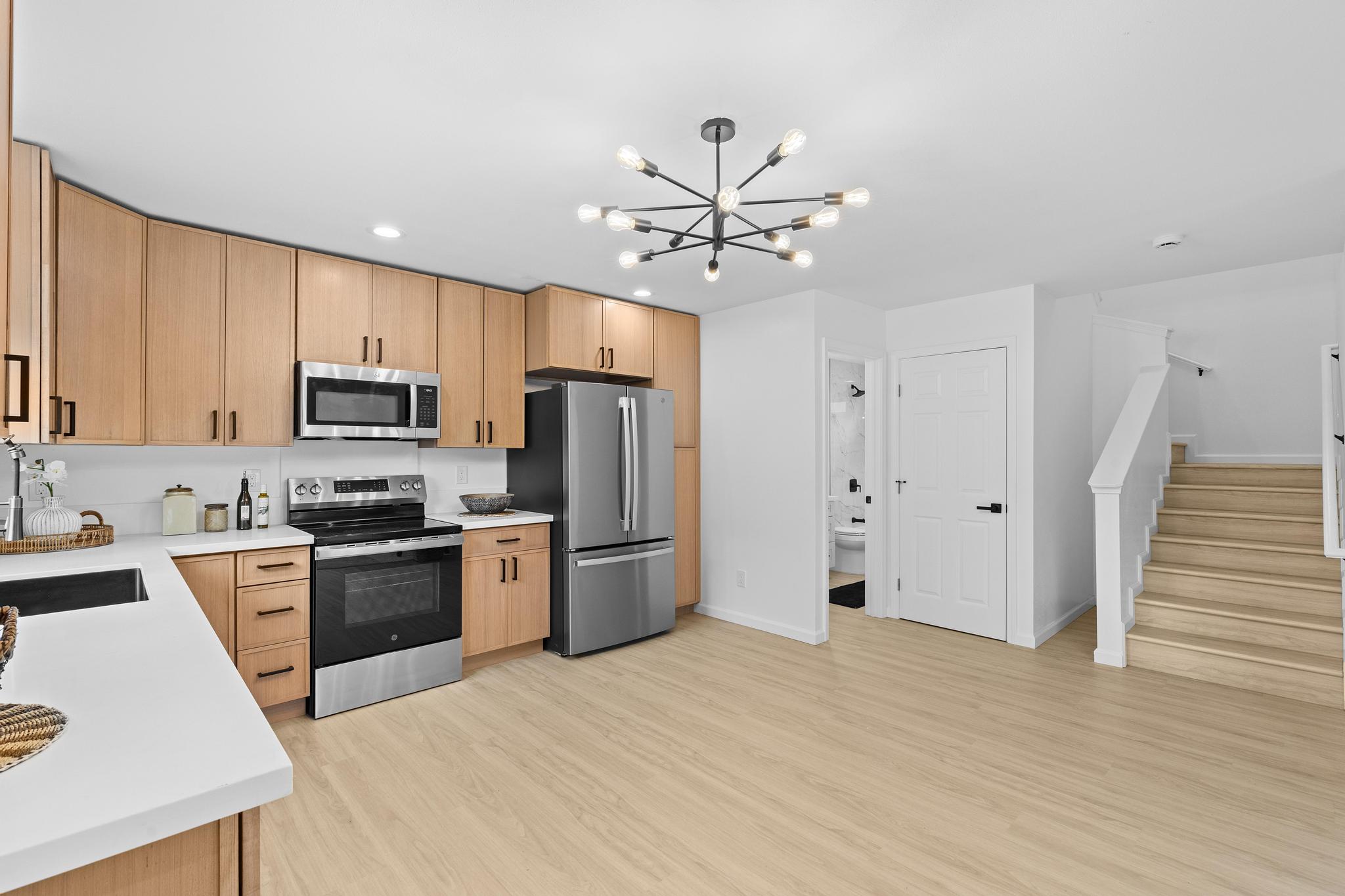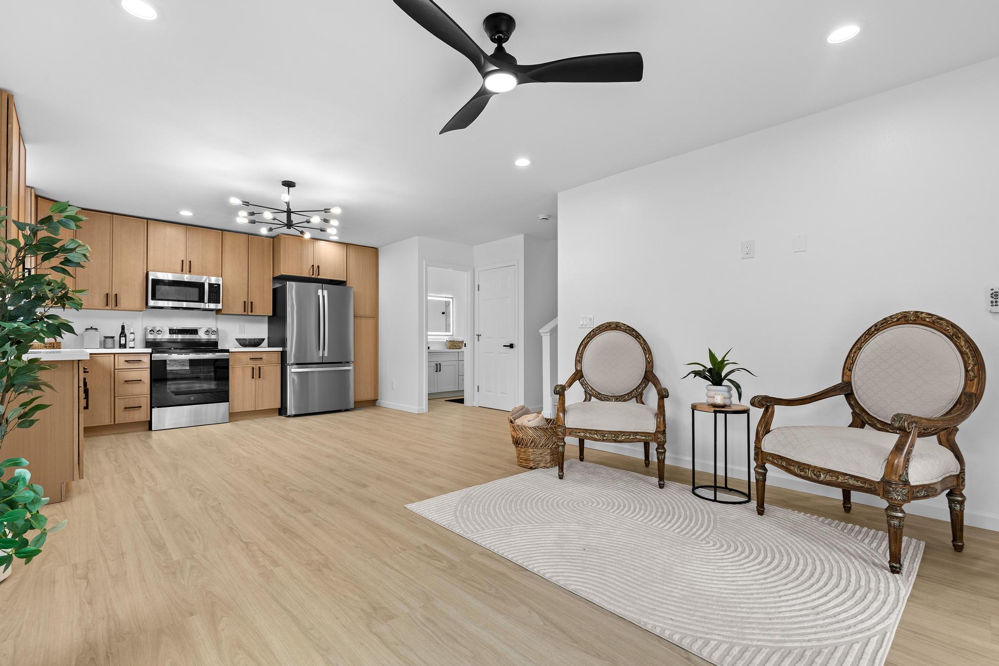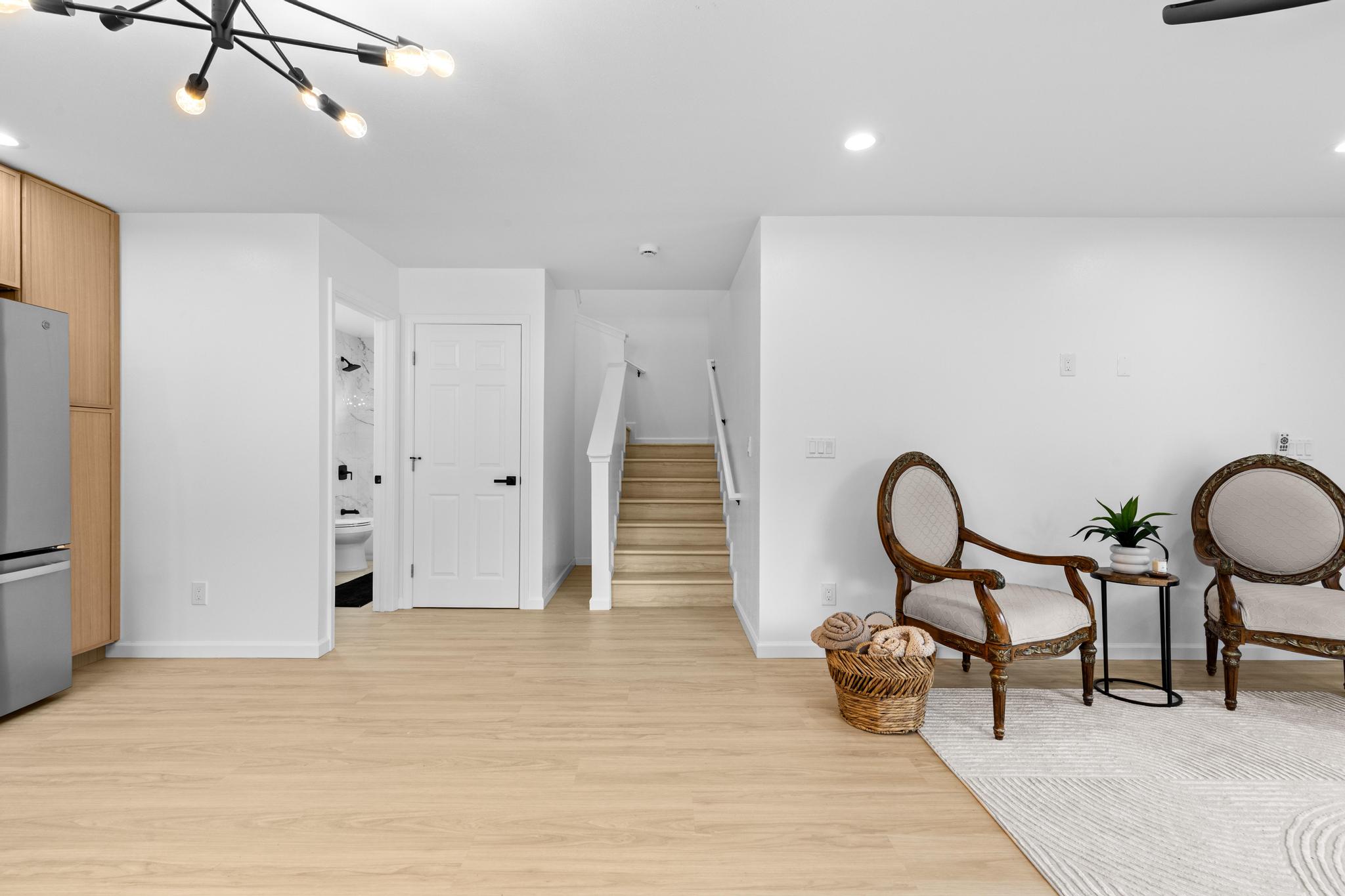 Downstairs, enjoy a bright and airy open concept living, dining, and kitchen area filled with natural light and airflow. The kitchen is finished with quartz countertops, modern cabinetry, and clean lines, offering a polished yet practical space for entertaining. A second full bathroom on the main level features stylish finishes and a tub/shower combination, ideal for guests. Additional storage beneath the staircase provides valuable functionality.