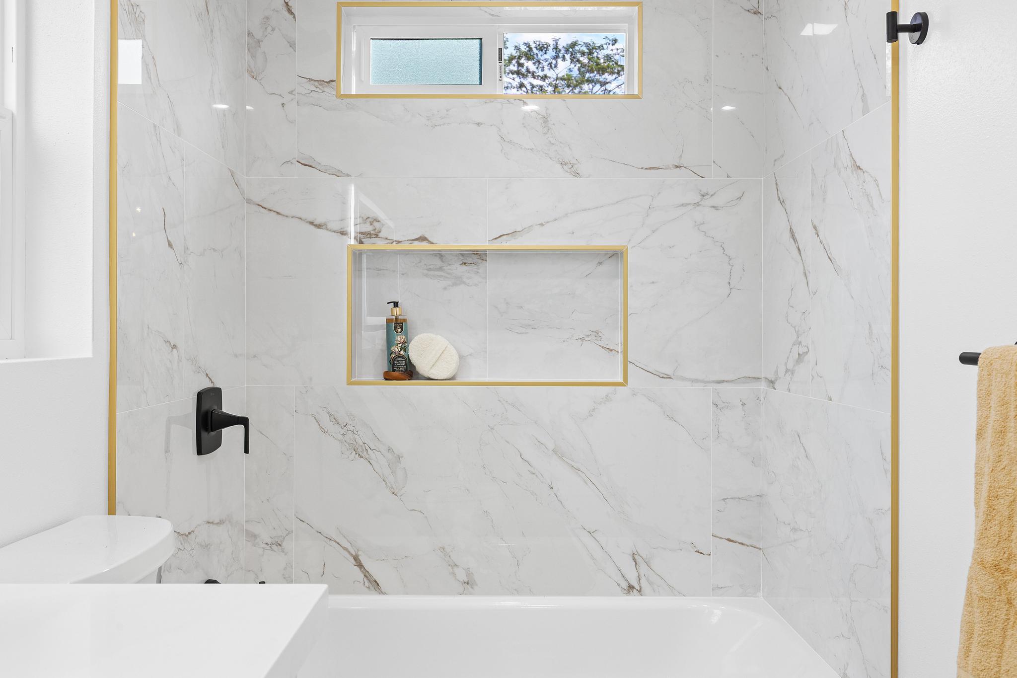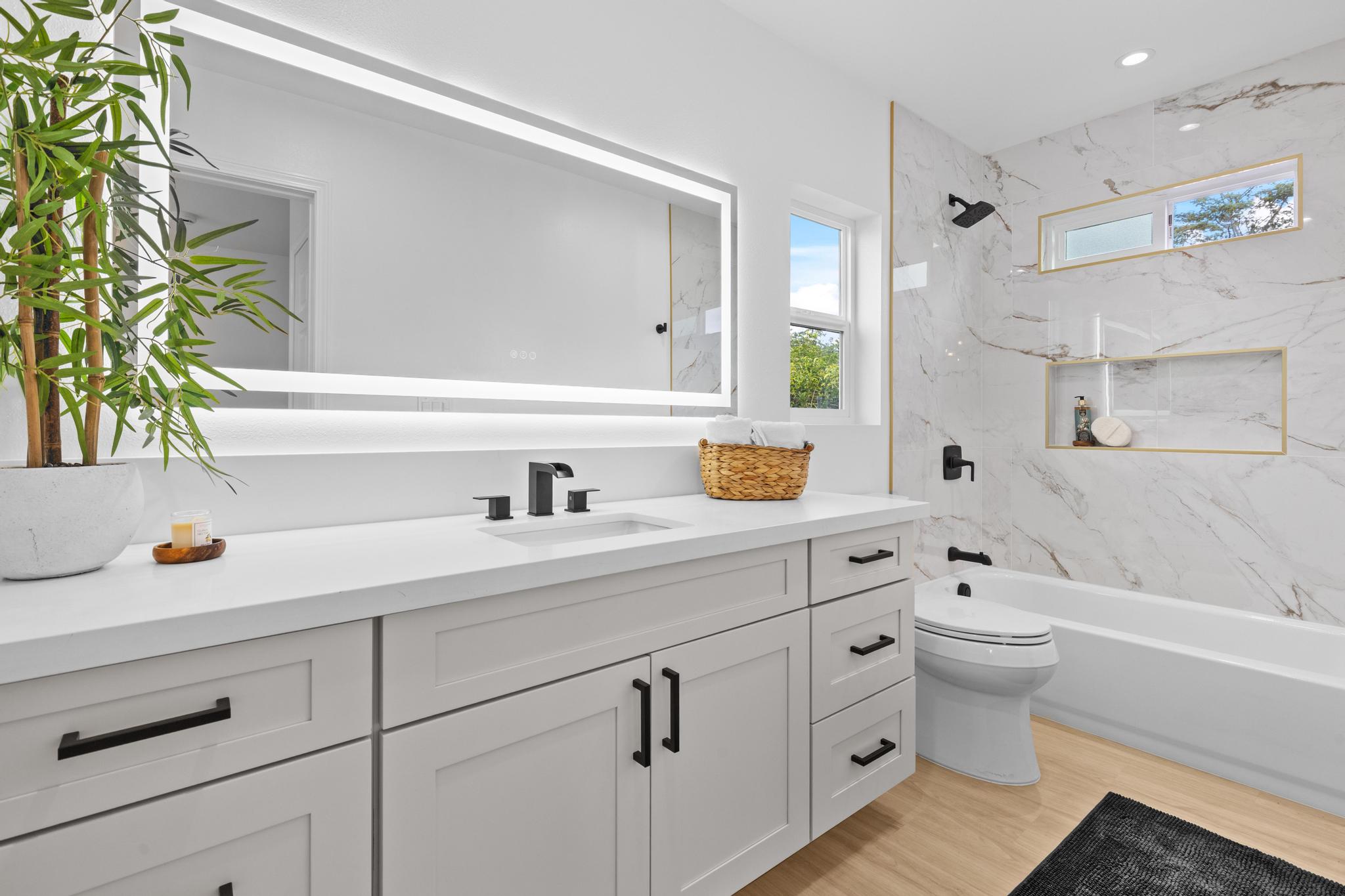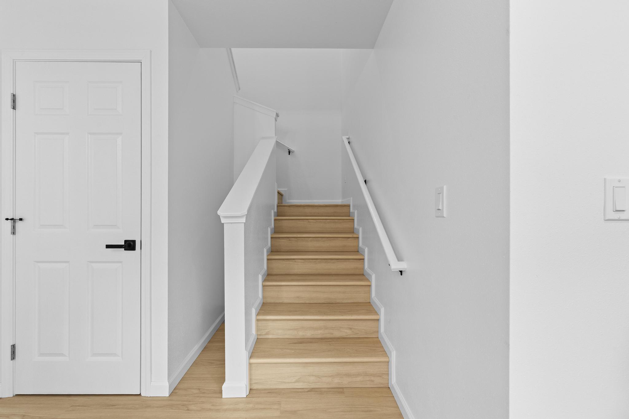 Downstairs, enjoy a bright and airy open concept living, dining, and kitchen area filled with natural light and airflow. The kitchen is finished with quartz countertops, modern cabinetry, and clean lines, offering a polished yet practical space for entertaining. A second full bathroom on the main level features stylish finishes and a tub/shower combination, ideal for guests. Additional storage beneath the staircase provides valuable functionality.