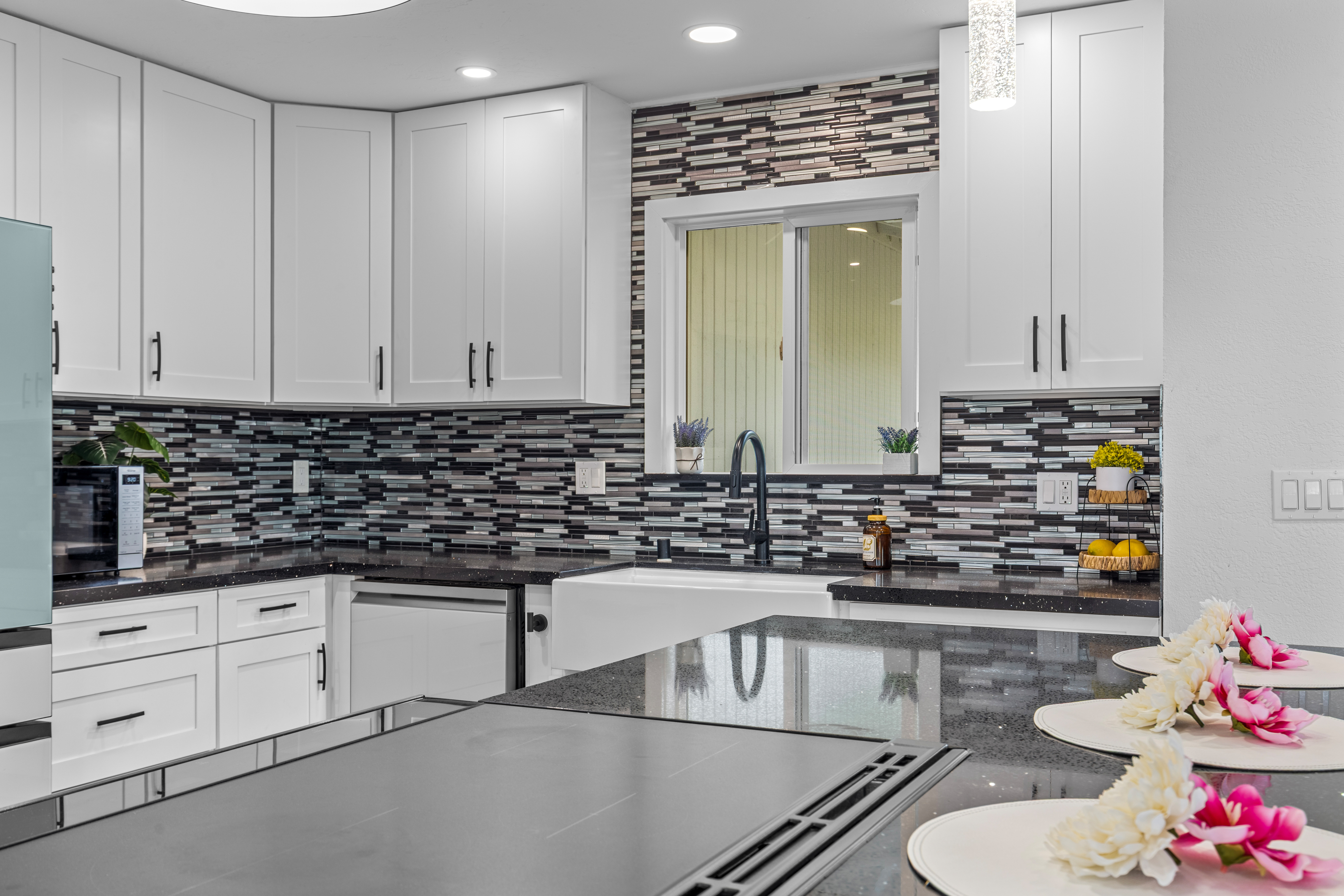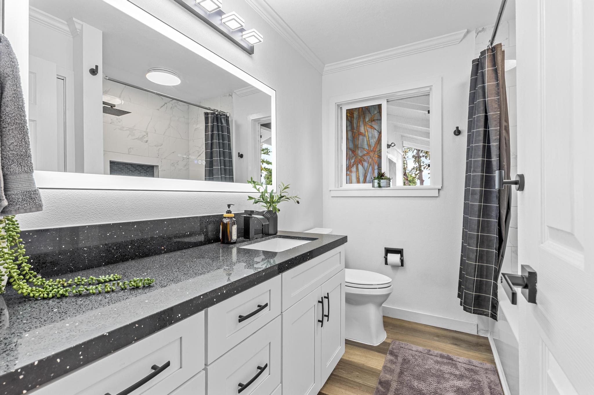 The open-concept design flows beautifully from the stunning kitchen into the grand living space, where soaring vaulted ceilings invite natural light to pour in, creating an airy, expansive feel. A striking custom accent wall adds architectural drama, while the beautiful kitchen island becomes the natural gathering place for conversation, celebration, and connection. Brand-new quartz countertops, new flooring, and fresh interior and exterior paint provide a crisp, luxurious finish throughout.