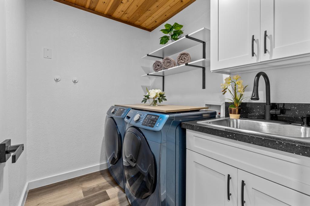 Retreat to your private primary suite, a serene sanctuary featuring a spacious walk-in closet and a spa-inspired en-suite bath with dual vanities. Two additional bedrooms offer versatility for guests, family, or a refined home office. Everyday convenience is elevated with an interior laundry room complete with a brand-new washer and dryer.