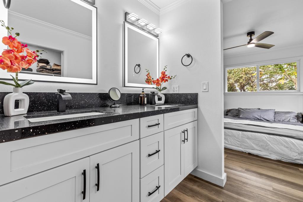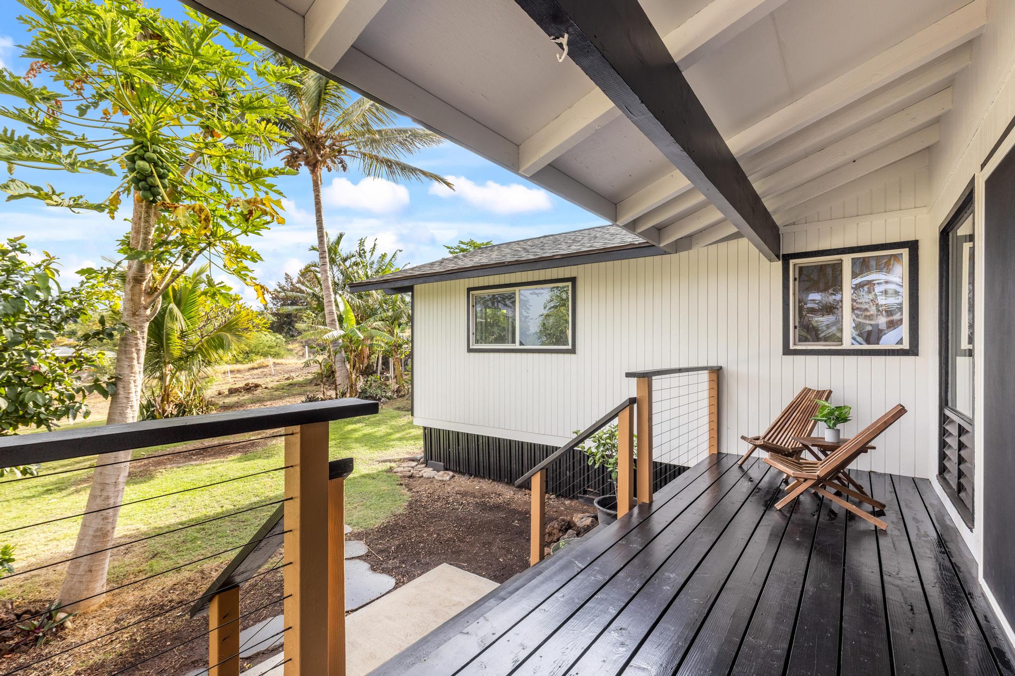 Step outside and experience pure island tranquility. The newly built back lanai captures breathtaking Kohala Mountain views -- the perfect setting for sunrise coffee, sunset wine, or evenings under the stars.