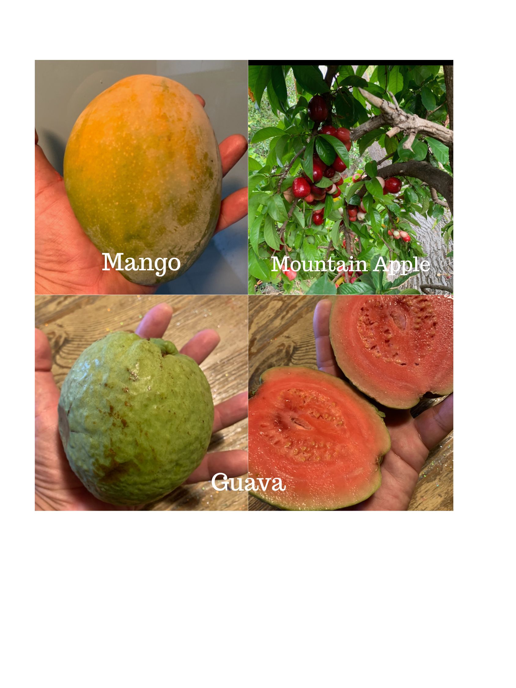 -Three varieties of avocados, sweet, juicy mangos and banana, pineapples, tangerine, guava, mountain apple, papaya, coconut, and fig, fresh lemongrass, oregano, mint, and ginger