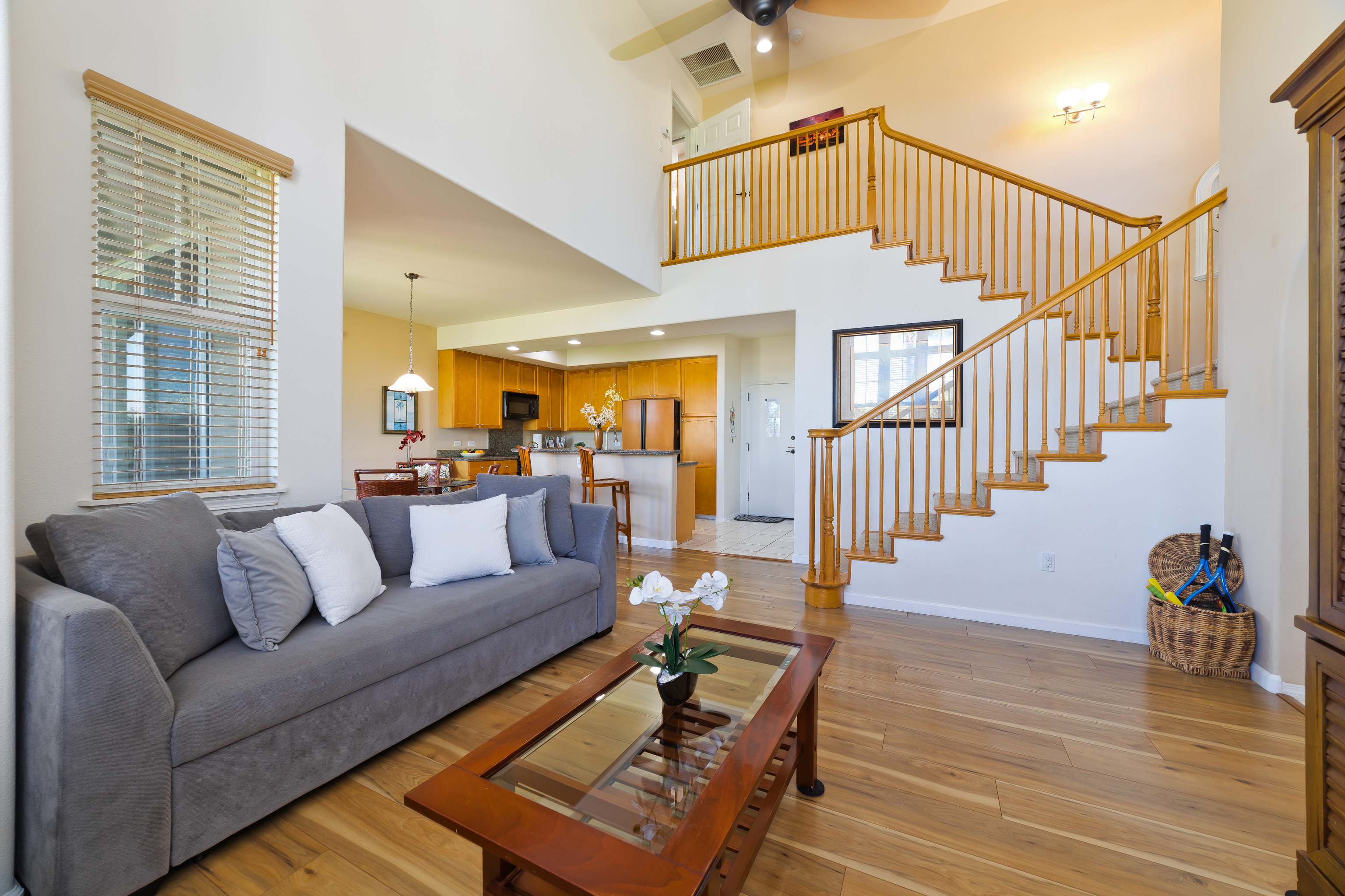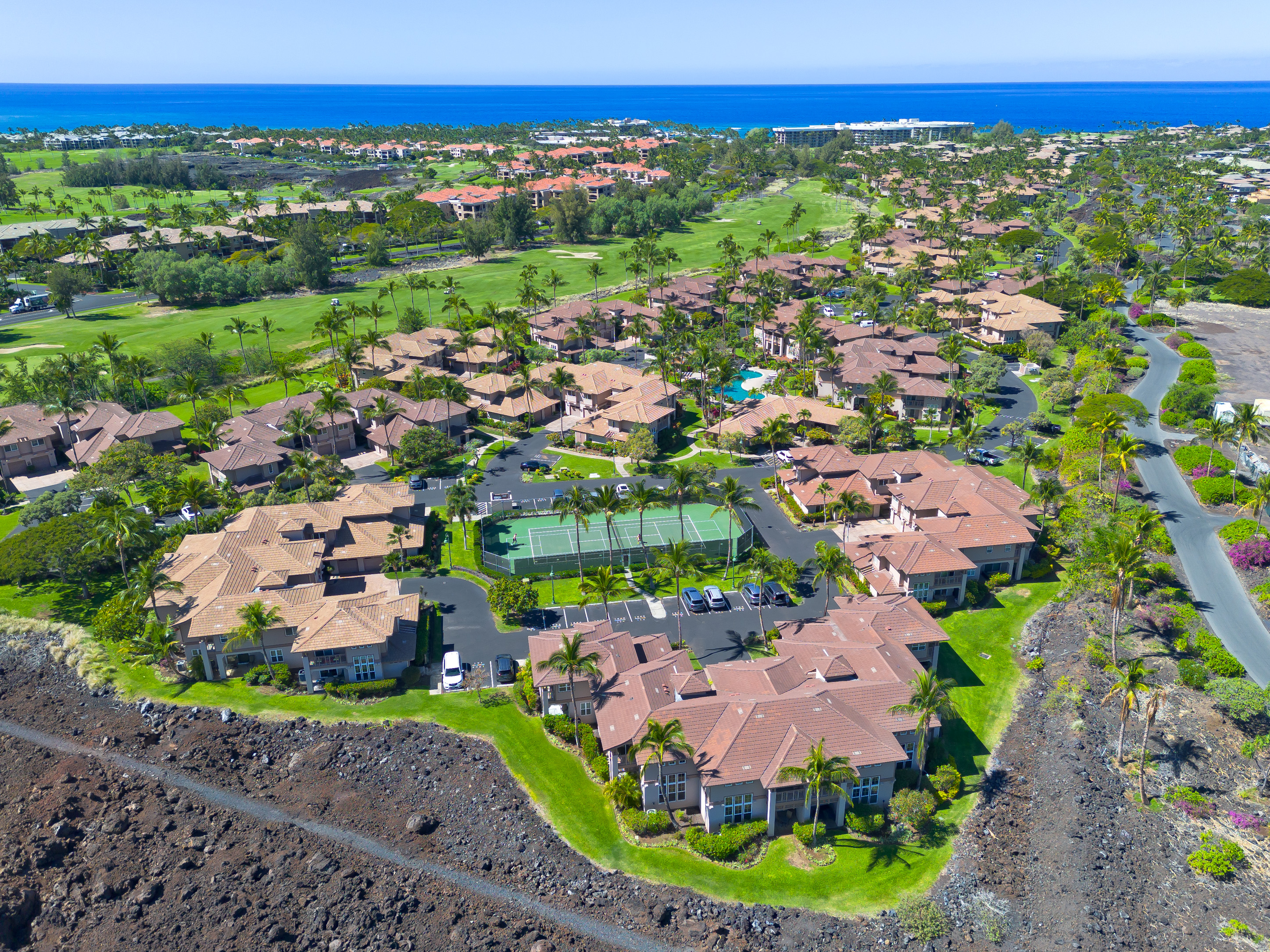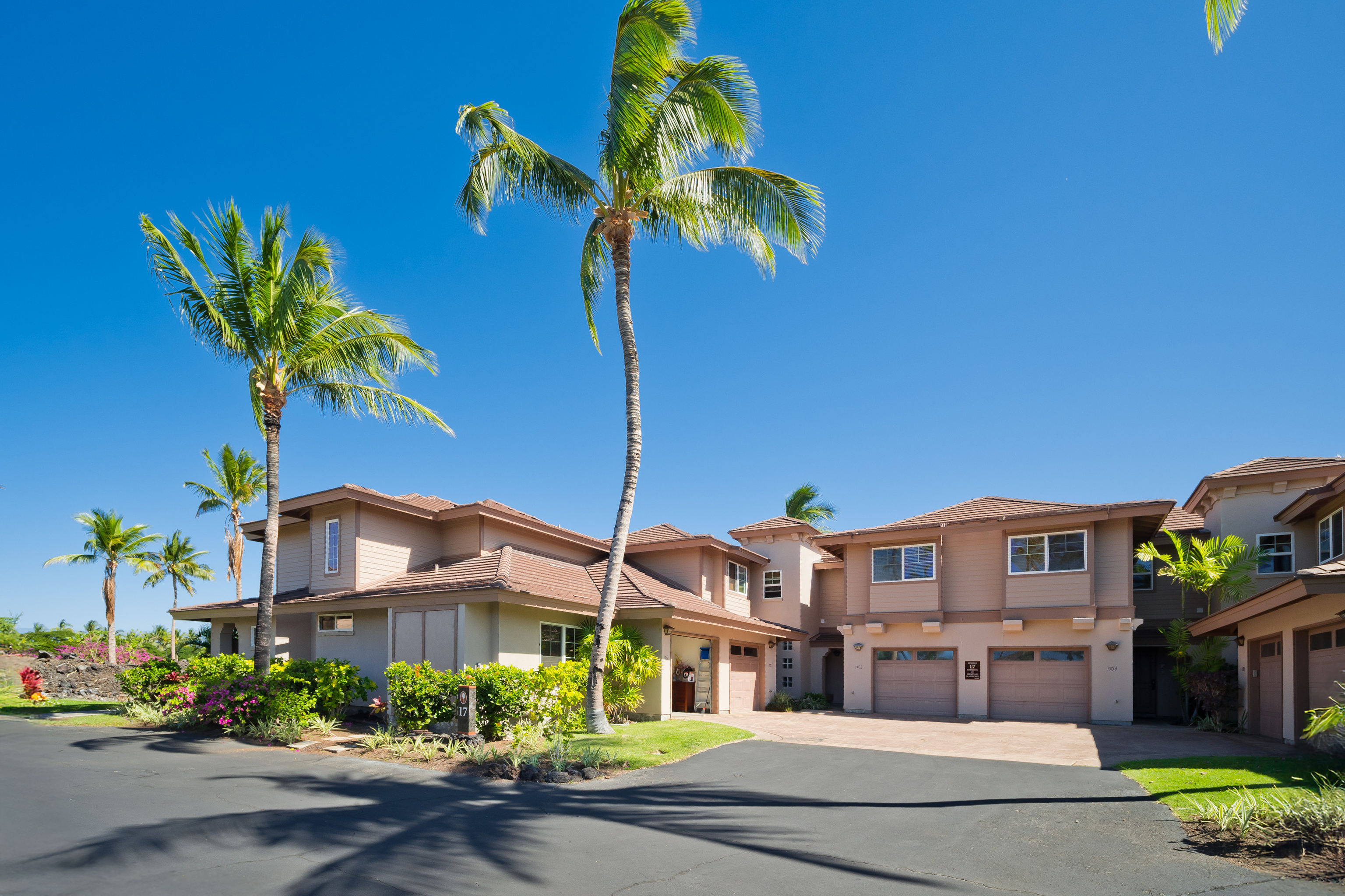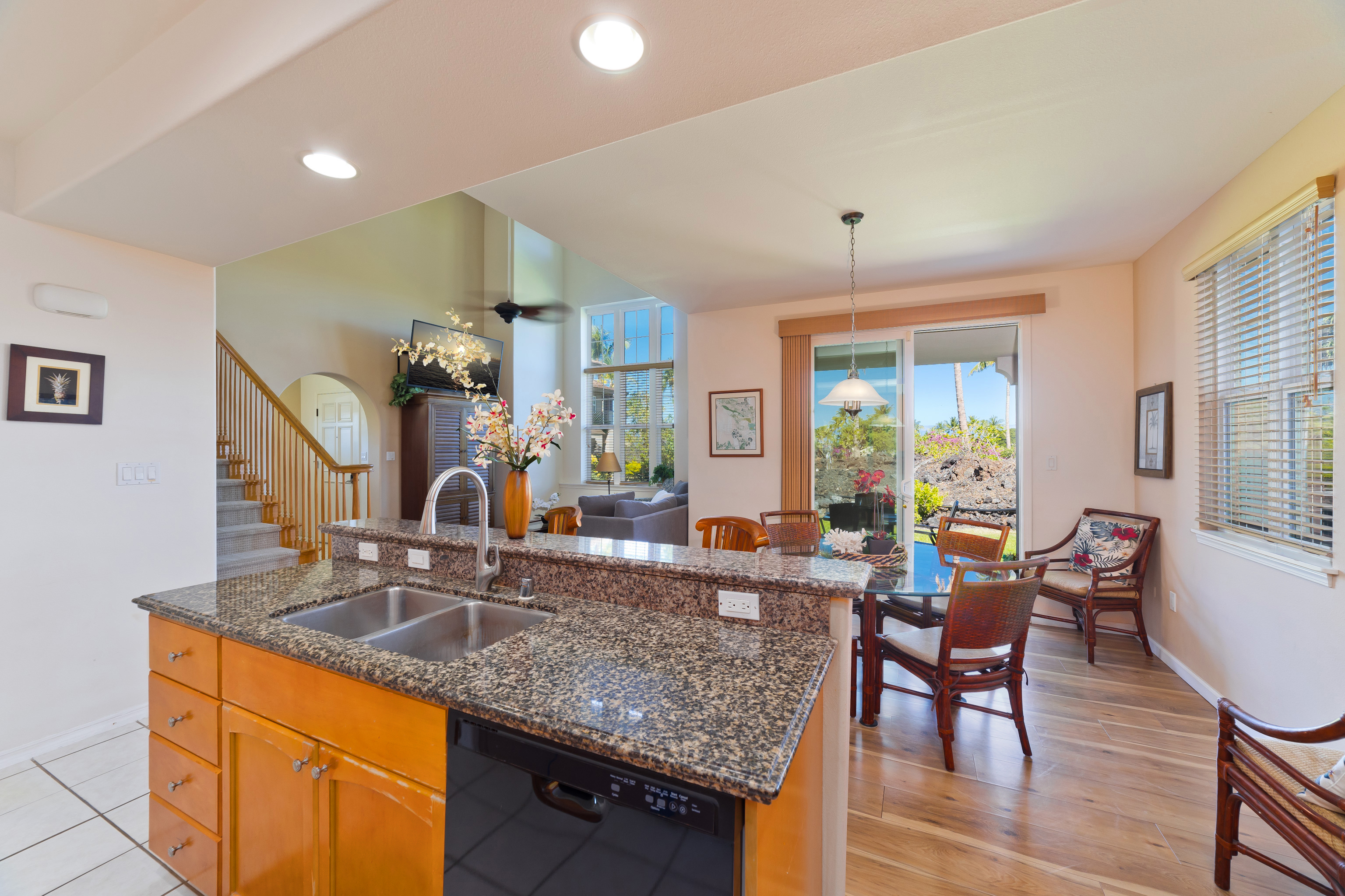 Nestled in a sought-after area of the community, the townhome boasts spectacular views of Kohala Mountain and surrounding lush greenery, providing a serene atmosphere. The layout offers excellent privacy with the guest bedroom and bathroom conveniently located on the first floor, while the primary suite with its own en suite bathroom and walk-in closet is upstairs. Enjoy this spacious corner unit with plenty of outdoor grass for recreation and relaxation.