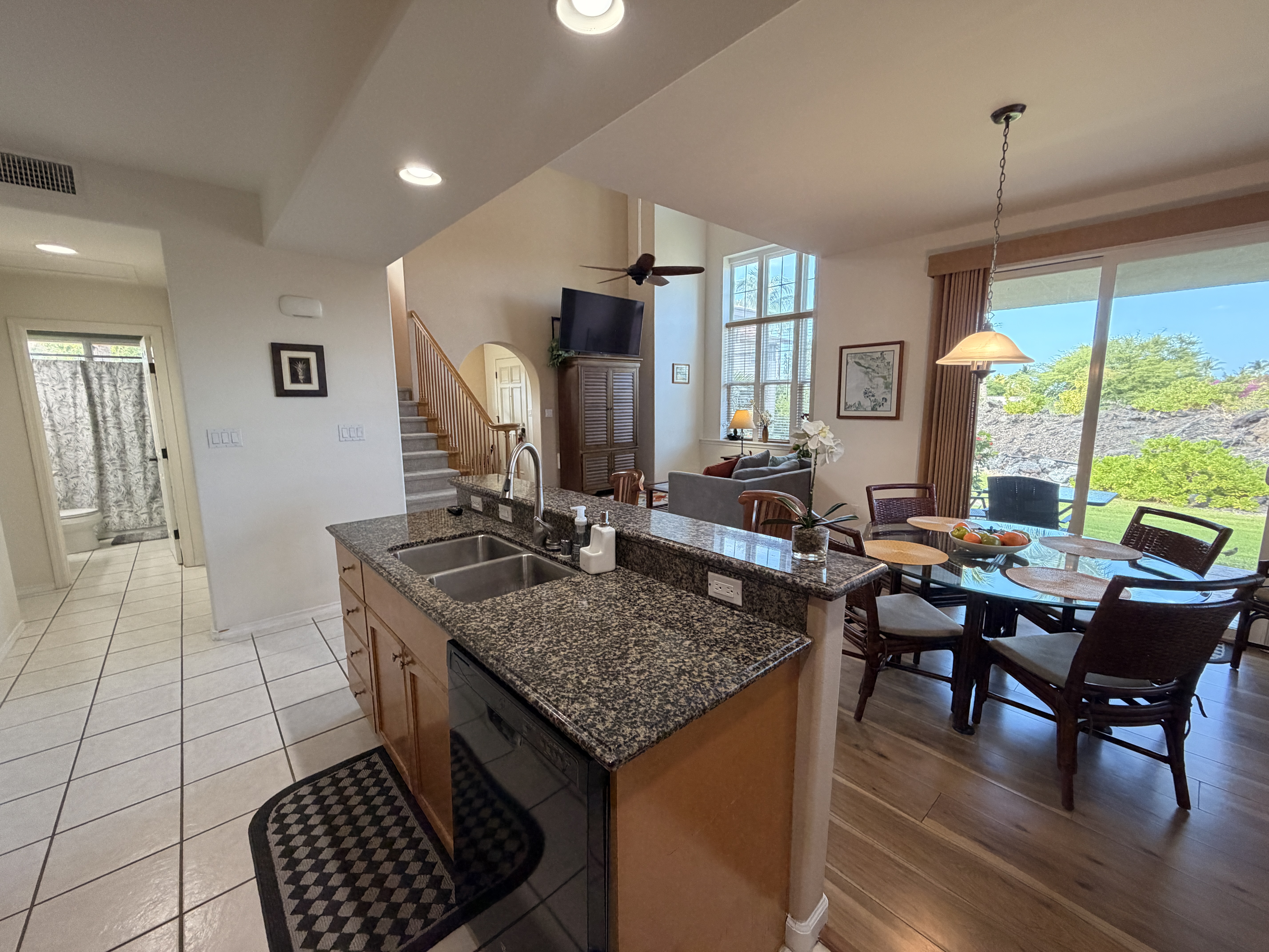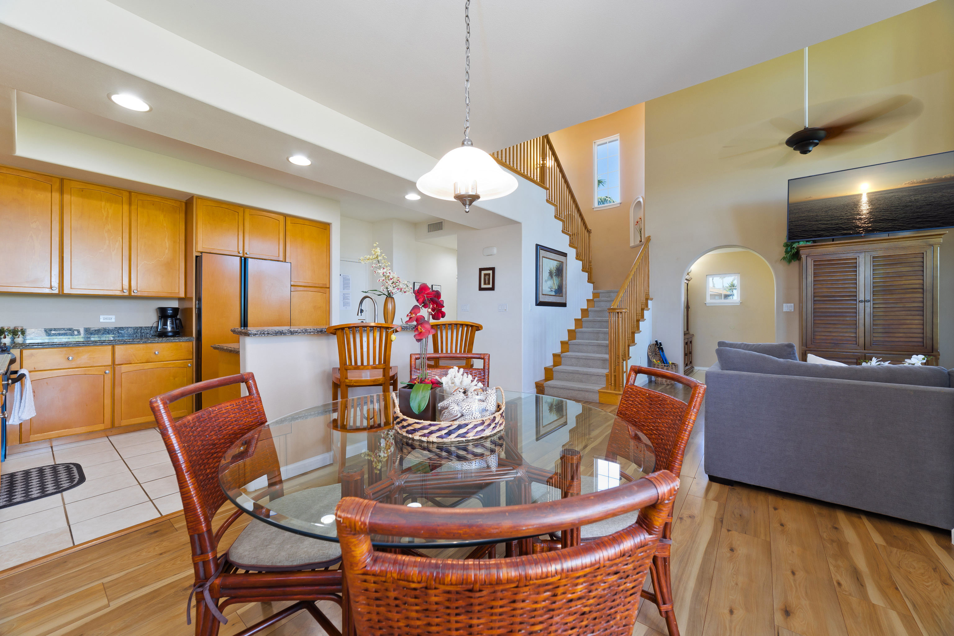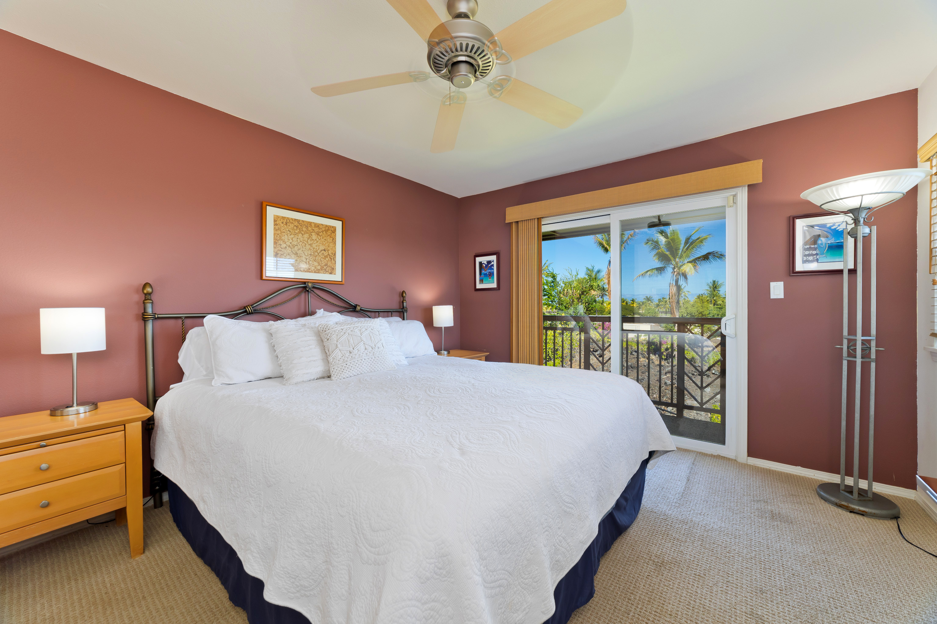 Nestled in a sought-after area of the community, the townhome boasts spectacular views of Kohala Mountain and surrounding lush greenery, providing a serene atmosphere. The layout offers excellent privacy with the guest bedroom and bathroom conveniently located on the first floor, while the primary suite with its own en suite bathroom and walk-in closet is upstairs. Enjoy this spacious corner unit with plenty of outdoor grass for recreation and relaxation.