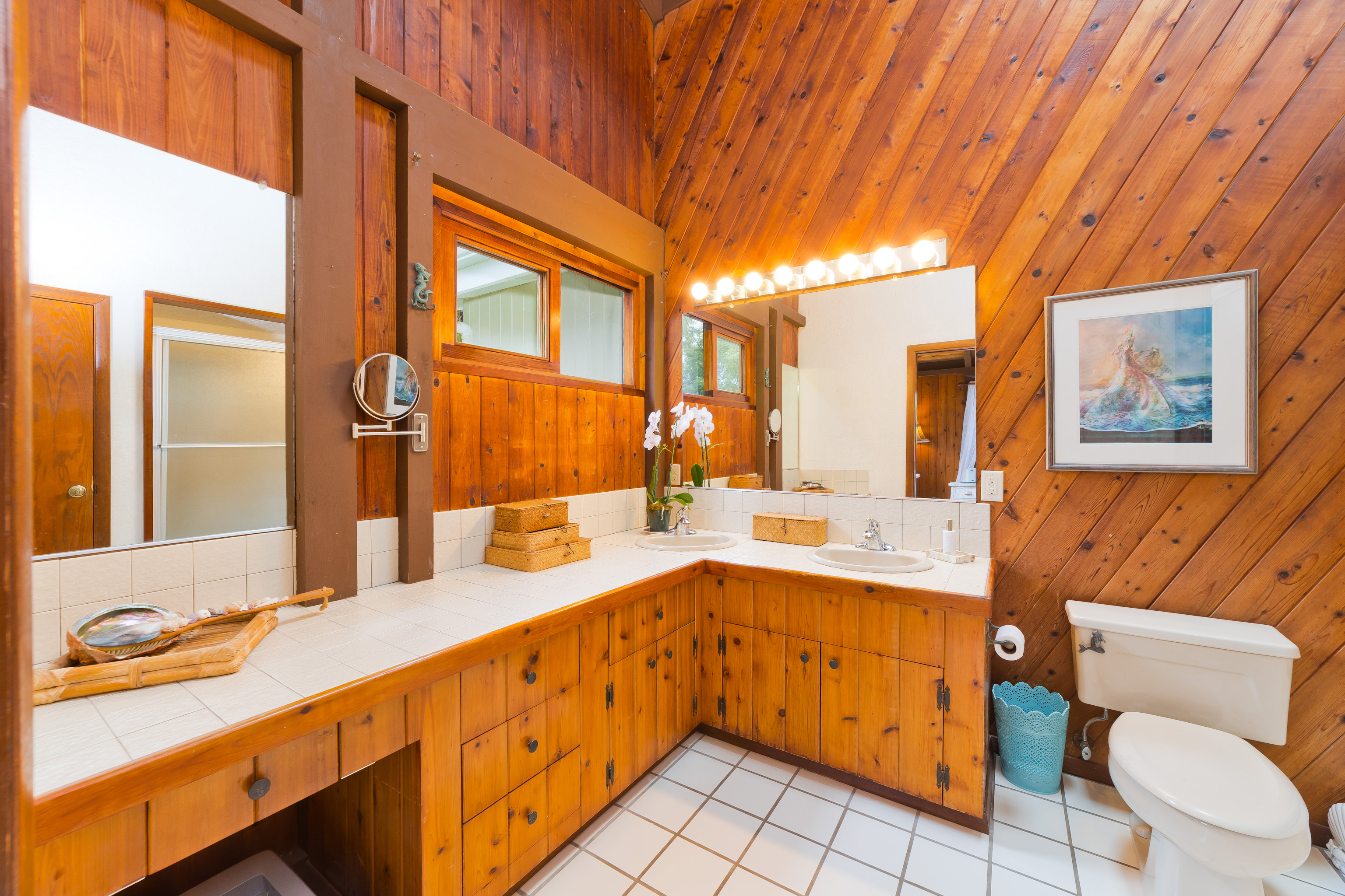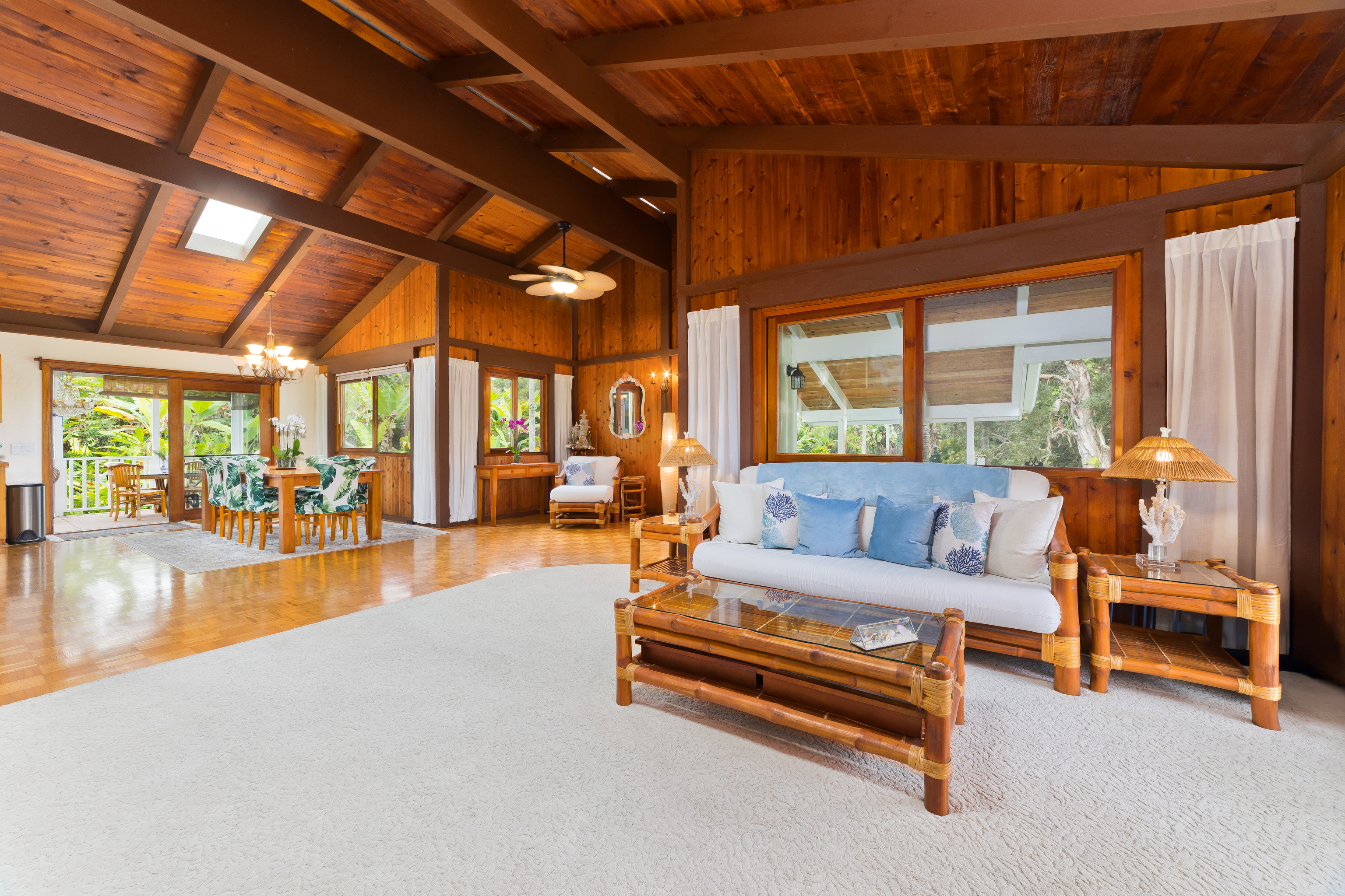 This special home is in the heart of Kona's coastal coffee town. As you drive into the quiet courtyard and parking area, you'll notice the love and care invested in the estate. This 5BR, 5BA home sits on 1.25 landscaped acres and features a spacious 3-bedroom main residence upstairs, plus two separate rooms downstairs, each with private entrances and en-suite bathrooms.